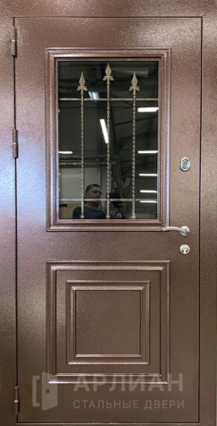 Входная коричневая дверь в частный дом со стеклопакетом и ковкой №11