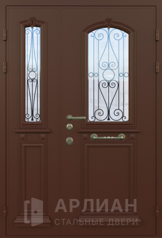 Двухстворчатая входная дверь со стеклом и ковкой №9
